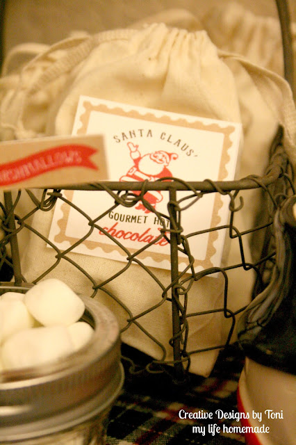 Mini canvas bags filled with individual packets of hot cocoa lined the wire baskets ready for use. I love how the AndersRuff gourmet hot chocolate printable tags fit perfectly on the front of the bags.